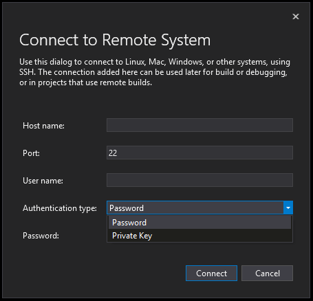 The first time you target a remote machine you will be prompted for connection information. This is triggered by building the project.